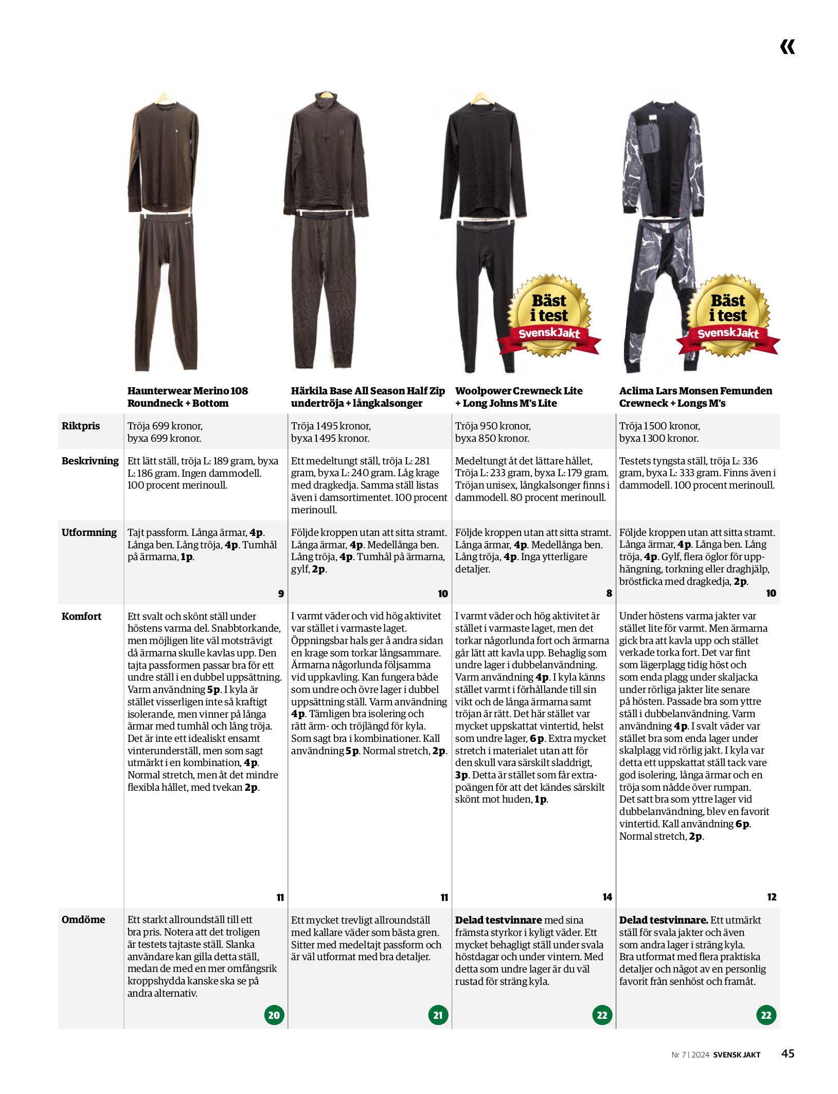 I Svensk Jakts juli-utgåva testar man nio olika underställ i merinoull. Bland konkurrenter från bla Woolpwer och Aclima sticker Haunterwears Merino 180 ut och hamnar i topp. "Ett starkt underställ till ett bra pris" avslutar Svensk Jakt och ger understället 20 poäng där vinnarstället får 22.