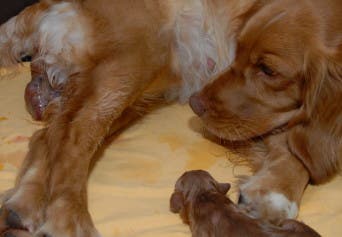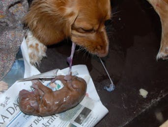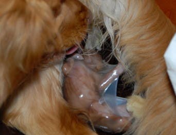Då blåsan är hel brukar tiken bita och slicka sönder denna så att valpen kommer ut. Tikens rengöring och avnavling av valparna kan se rätt hårdhänt ut, men det är helt normalt.
