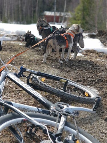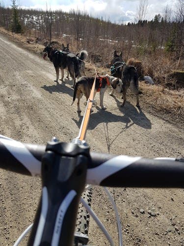 Cykelträning använder jag mig av under vår- och sommar, här behöver vi tänka på temperatur och vägval. Jag använder mig uteslutande av skogsbilvägar och skogsstigar, håller mig borta från asfaltsvägar där trafiken ofta är tätare och underlaget alldeles för stumt, vilket sliter allvarligt både på kropp, leder och tassar. Jag har valt att använda mig av en cykelantenn från Non-stop dogwear och har hundarna framför cykeln likadant som vid löp och skidträning. Hundarna framför eller vid sidan av cykeln är väl egentligen en smaksak skulle jag säga, mina hundar är vana att springa framför och då jag alltid har 4-6 hundar med samtidigt så känns det både säkrare och mindre struligt att ha dom framför mig. Dessutom har jag då större möjlighet att ta in på och utforska en smal skogsstig då dom springer på led framför mig. Glöm för allt i världen inte cykelhjälm, många är historierna om jägare som cyklat med sin hund med kopplet i näven utan hjälm och många har inte slutat lyckligt...