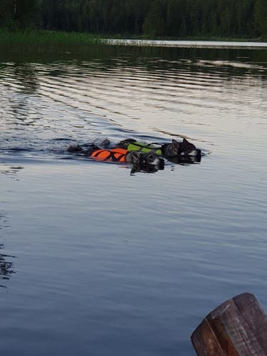 Simträning och vattenlek med hundarna är sommarens och hela årets favorit. Så fort vattentemperaturen blir badvänlig så drar vi i gång med vattenträning. Jag använder mig oftast av roddbåt under träningspasset och hundarna följer båten lösa. Då hundarna är olika snabba och duktiga simmare så sprider dom ofta ut sig lite efter båten, vilket gör att jag alltid använder flytväst av säkerhetsskäl. Flytvästen gör också hundarna mera avslappnade i vattnet och jag törs dra ut på tiden i vattnet för en god träningseffekt. Det bästa med simträningen är att kunna träna hunden samtidigt som man svalkar den under dom varmaste sommardagarna och jag garanterar att du kommer att imponeras av resultaten av din hunds fysik efter vattenträningen.