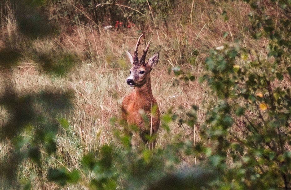 Gyllenbrun päls Mystiken kring spökbocken lever kvar och några dagar senare börjar det lida mot sen eftermiddag när Calle kommer gående längs en åkerkant över en kulle. Genom lövverket ser han den gyllenbruna kroppen av ett rådjur står och betar i en glänta ca. 400 meter bort.
