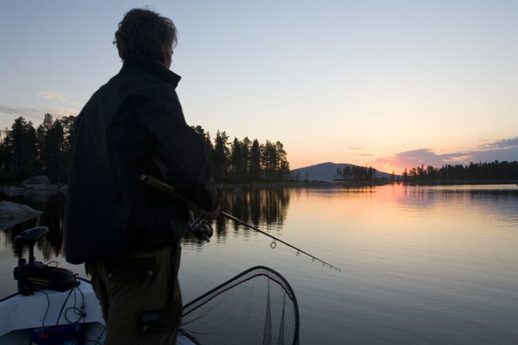 Gäddorna leker och jagar runt båten i den spegelblanka grunda viken. Ibland ser vi någon större stjärtfena i ytan och tillslut blir det för frestande att vara åskådare. Vi fiskar ett par timmar till och när vi lägger oss vid femtiden kan vi konstatera att vi har haft en fantastisk kväll och natt.