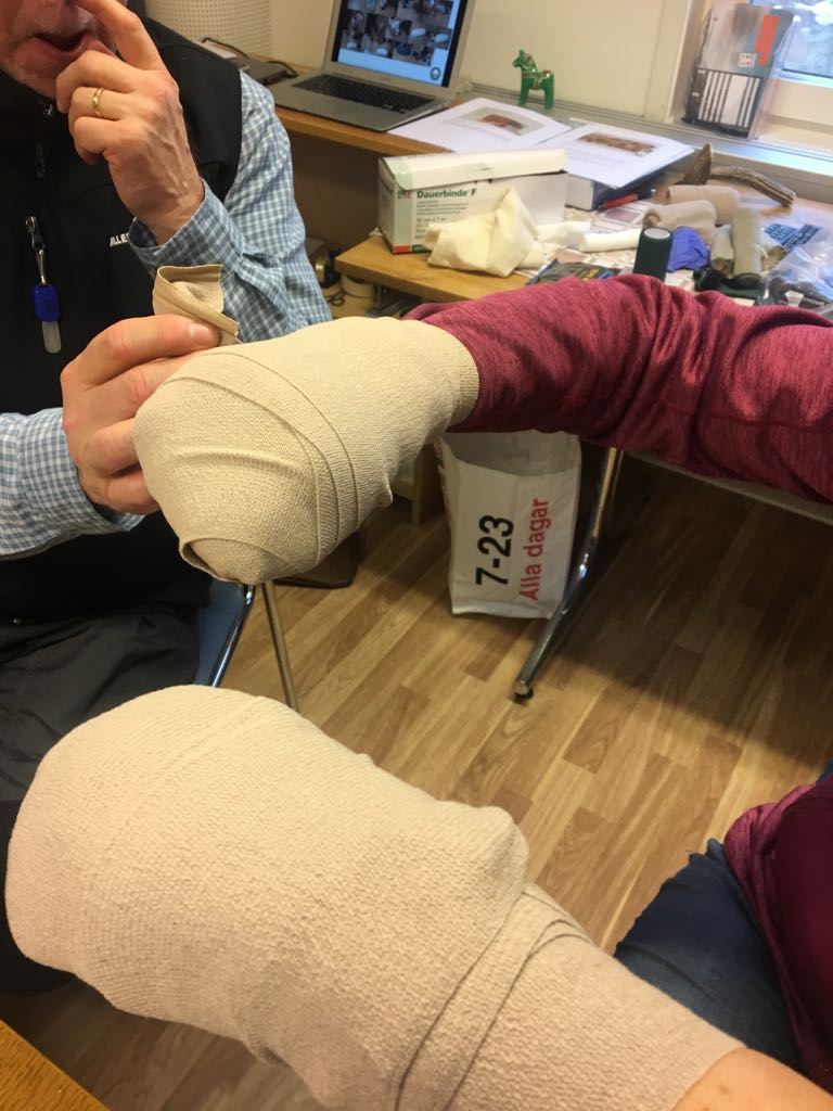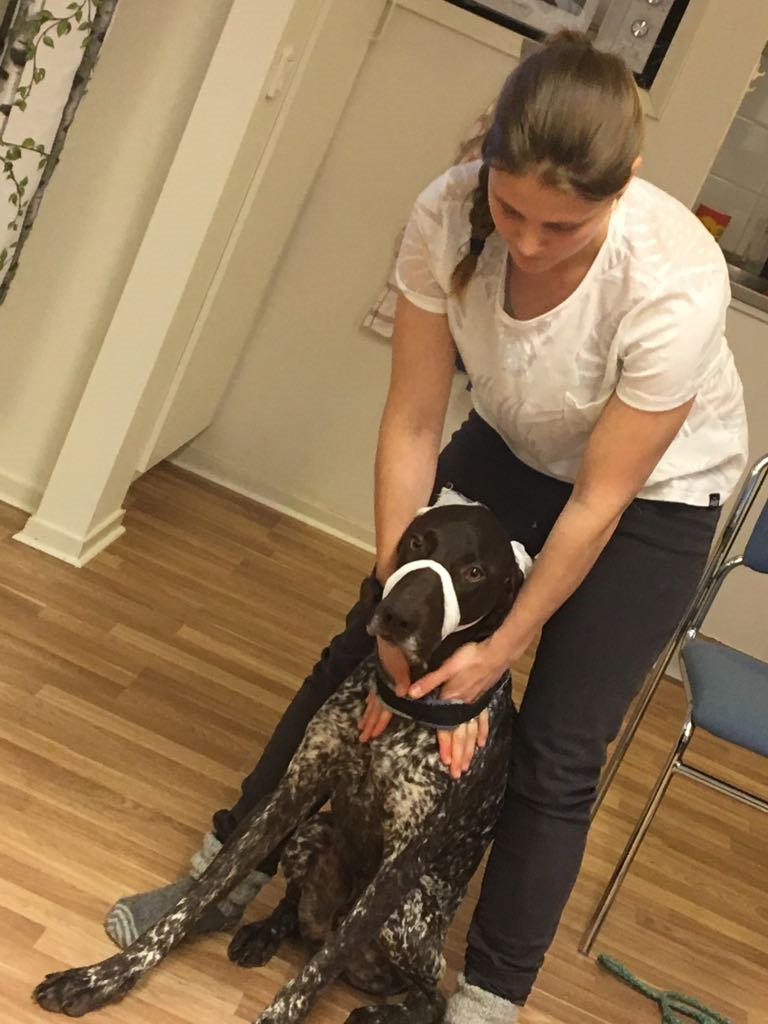 Eftermiddagen ägnades åt vår fyrfotade vän men allt från att göra en provisorisk munkorg, hur man säkert och smidigt lägger ner sin hund från stående till bandagering och hur man bär en skadad hund.