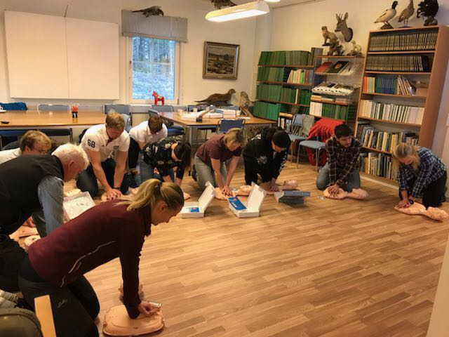 Kursen innehåller Hjärt-och lungräddning för människa, hur man använder en hjärtstartare (finns inte många i skogen men det är en bra kunskap) till anpassat hur man lindar stukningar och stagar anpassat för våra jaktdagar.