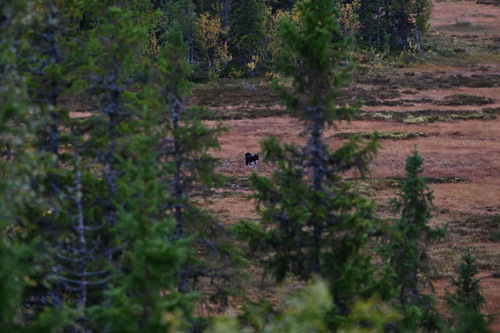 Älgen går i gångstånd in på grannens mark upp mot fjället innan den sakta vänder tillbaka in på jaktmarken . Efter en promenad som inkluderade vadning över bäckar och bestigning av branta sluttningar så står vi till slut bara cirka 150 meter bort från det nu ekande ståndskallet. Vi passar på att lägga av oss ryggsäckarna och smyger tätt i varandras fotspår i hopp att undvika även den minsta kvist . Skallen duggar tätt, pulsen stiger. På ca 50 meter får vi syn på Nelson och strax därefter en älgtjur som långsamt kliver bort från ståndplatsen. Läget blir aldrig riktigt bra för Fredrik, och ståndskallet övergår i gångstånd .