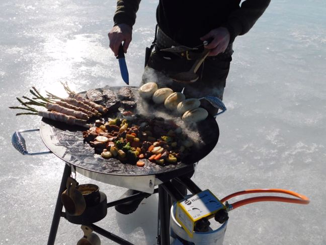 Joakim Mikaelsson från Jaktia Pro Team testar Hällmarks kompletta stekhällsset.