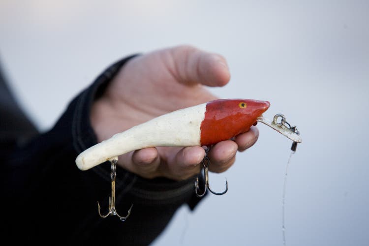 Fisket första timmen är trögt. Vi ser flera gäddor under båten i det klara vattnet men ingen vill hugga. Nicklas öppnar en ny betesask och plötsligt faller blicken på ett hemsnidat bete. Nicklas berättar att det är en vobbler han gjorde i träslöjden i sjunde klass.