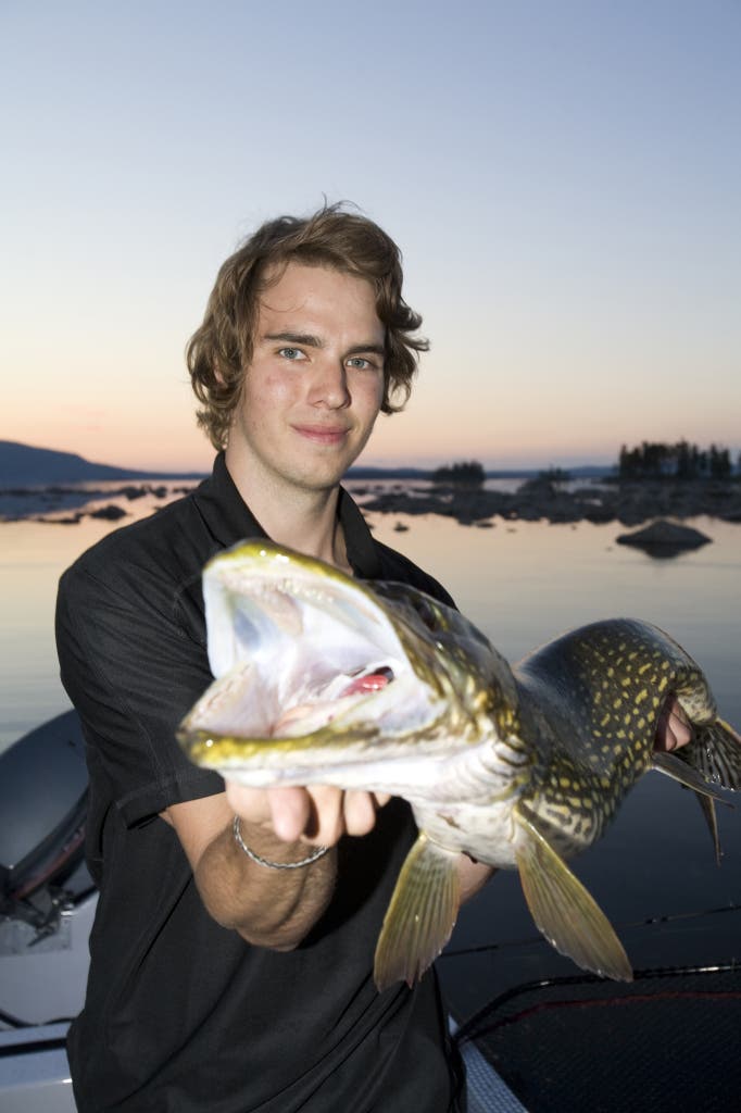 Det är en fin gädda på 108 centimeter som han tar på en Four play, som är ett av favoritbetena. Några minuter senare landar jag en hundratvåa på en Mc Mio och efter det tar vi en matpaus. Klockan har börjat närma sig halv två på natten och det är fortfarande ljust. Nicklas har med en rejäl skål med pastasallad och bredda mackor så risken att vi ska behöva fiska hungriga är obefintlig.