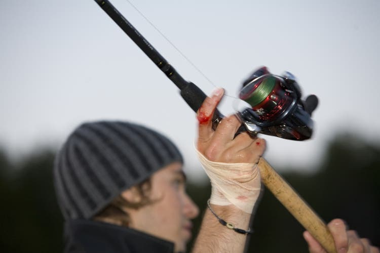 Vi sjösätter båten vid en stuga och beger oss ut på sjön. Nicklas har med sig ett par kraftiga Hurricane haspelspön på 9 fot med Shimanorullar i 5000 storlek laddade med 0,21 mm flätlina. Jag frågar Nicklas om hans val av utrustning och han svarar att han tycker haspeln har fördelar då de trasslar mindre och är mer lättkastade med varierade betesvikter.