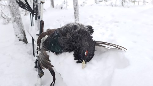 Efter en kortare vätskepaus tar jag av mig jackan, packar ner den i ryggsäcken för att sedan börja skida vidare. Ett par stavtag senare ser jag någonting i ögonvrån. Tar fram kikaren för att kolla tvärs över hygget. Det är en tjäderbetad tall med snöfri topp. Sekunden senare får jag se den, äntligen! En tjäder som sitter och betar! Trots att den sitter helt öppet så är den inte helt lätt att se. Det lätta snöfallet och det mörka trädet i bakgrunden kamouflerar tuppen bra. Jag mäter avståndet, 155 meter. Försiktigt backar jag tillbaka till samma plats där jag minuten innan tagit av mig jackan. I skydd av tre tallar förbereder jag allt. Klickar 4 klick för avståndet, sätter in magasinet, mantlar in en kula och säkrar geväret. Lägger ryggsäcken vid en av tallarna och tar stöd. Tuppen gungar lätt i vinden. Efter alla timmar, alla mil på skidor den här säsongen så kommer tillslut läget som jag väntat på. Jag tar några djupa andetag och kramar av skottet. Pang! Med ett dunmoln lämnar tjädertuppen tallkronan och faller rakt ner i backen.